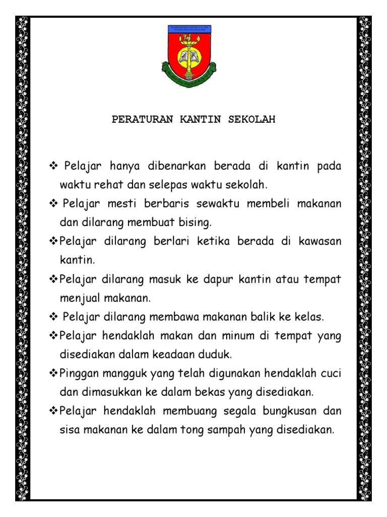 Lesen perniagaan yang sah diperolehi daripada Pihak Berwajib Kontrak. KEHADIRAN 11 Murid dikehendaki berada dikawasan sekolah sebelum 720 pagi. Tidak menjual jajan yang tidak memenuhi kualifikasi sehat seperti yang mengandung zat berbahaya atau mikroba.