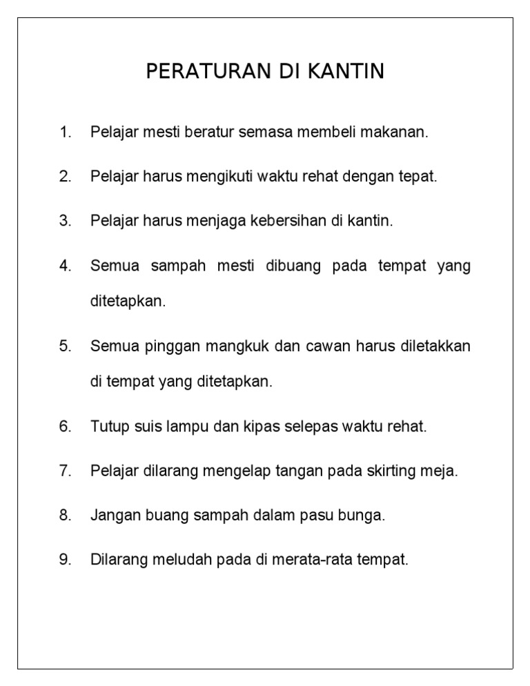 Pelajar mesti menggunakan sinki yang terdapat di kantin untuk mencuci tangan sebelum dan selepas makan 6. Peraturan di kantin sekolah Saturday February 12 2022 Edit. Peraturan Ketika Jam Istirahat Sekolah.
